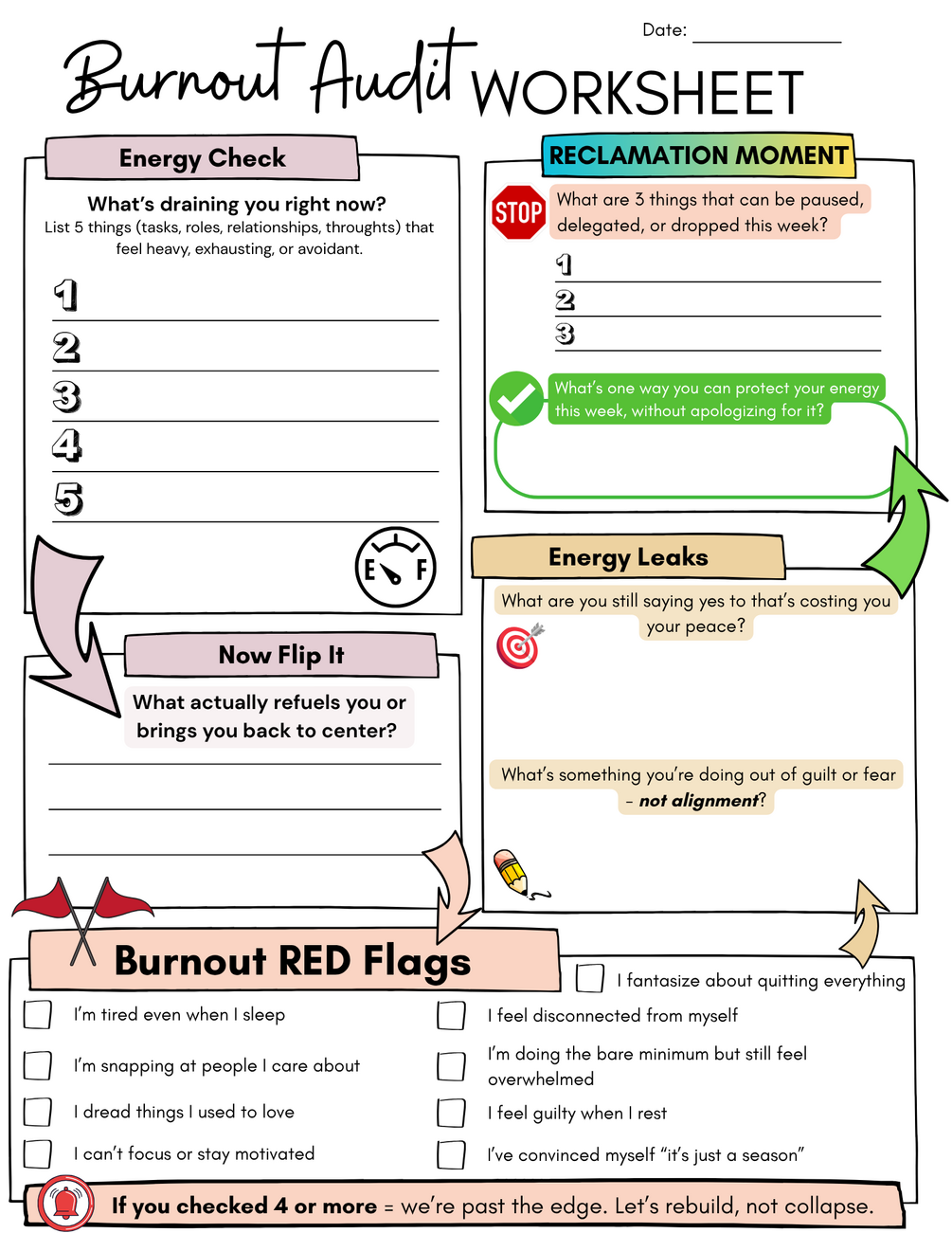 - 1-page printable Burnout Audit Worksheet (PDF)